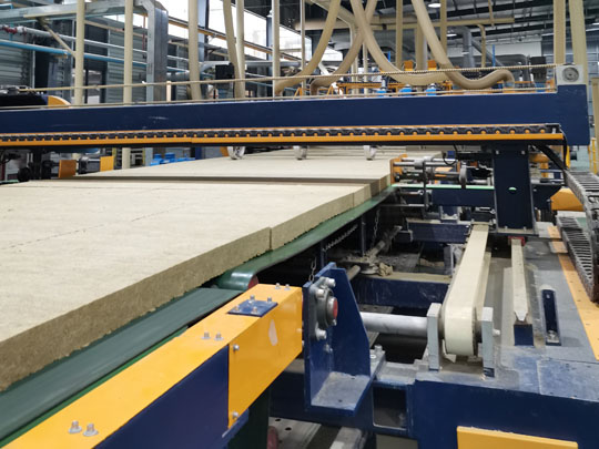 齊工巖棉板是以玄武巖為主要原材料,經(jīng)過沖天爐高于1450℃使原材料充分熔化,經(jīng)過高速離心機甩絲,形成巖棉纖維,用高速鼓風(fēng)機使其噴吹冷卻成型,在噴吹過程中添加一定比例的高效粘合劑,由大型擺錘設(shè)備呈三維布棉狀態(tài)均勻鋪棉,由履帶將布好的巖棉傳送至壓力設(shè)備中,使其形成一定密度的巖棉板,后經(jīng)高溫烘干爐烘干后,送至冷卻出風(fēng)口使其冷卻固化,切割不同規(guī)格的成品。